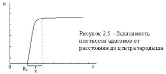2). Захват зародышем диффундирующих по поверхности подложки адсорбированных атомов. Зародыши являются стоком диффундирующих атомов. Вокруг зародыша образуется зона с градиентом плотности адсорбированных атомов (рисунок 2.5), который и определяет направление и плотность потока диффузии. Ширина градиентной зоны соизмерима с длиной диффузионного пробега адатомов металла.