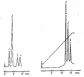 Рис. 2. Хроматограмма изомеров фталевой кислоты, полученная на колонке размером 300 Х 4 мм с µ-бондапаком C18, подвижная фаза – вода с добавкой реактива А, метанол с добавкой реактива А, градиент от 5 до 40% метанола за 15 мин, скорость потока 2 мл/мин, детектор – УФ (254 нм): 1 – терефталевая кислота; 2 – ортофталевая кислота; 3 – изофталевая кислота